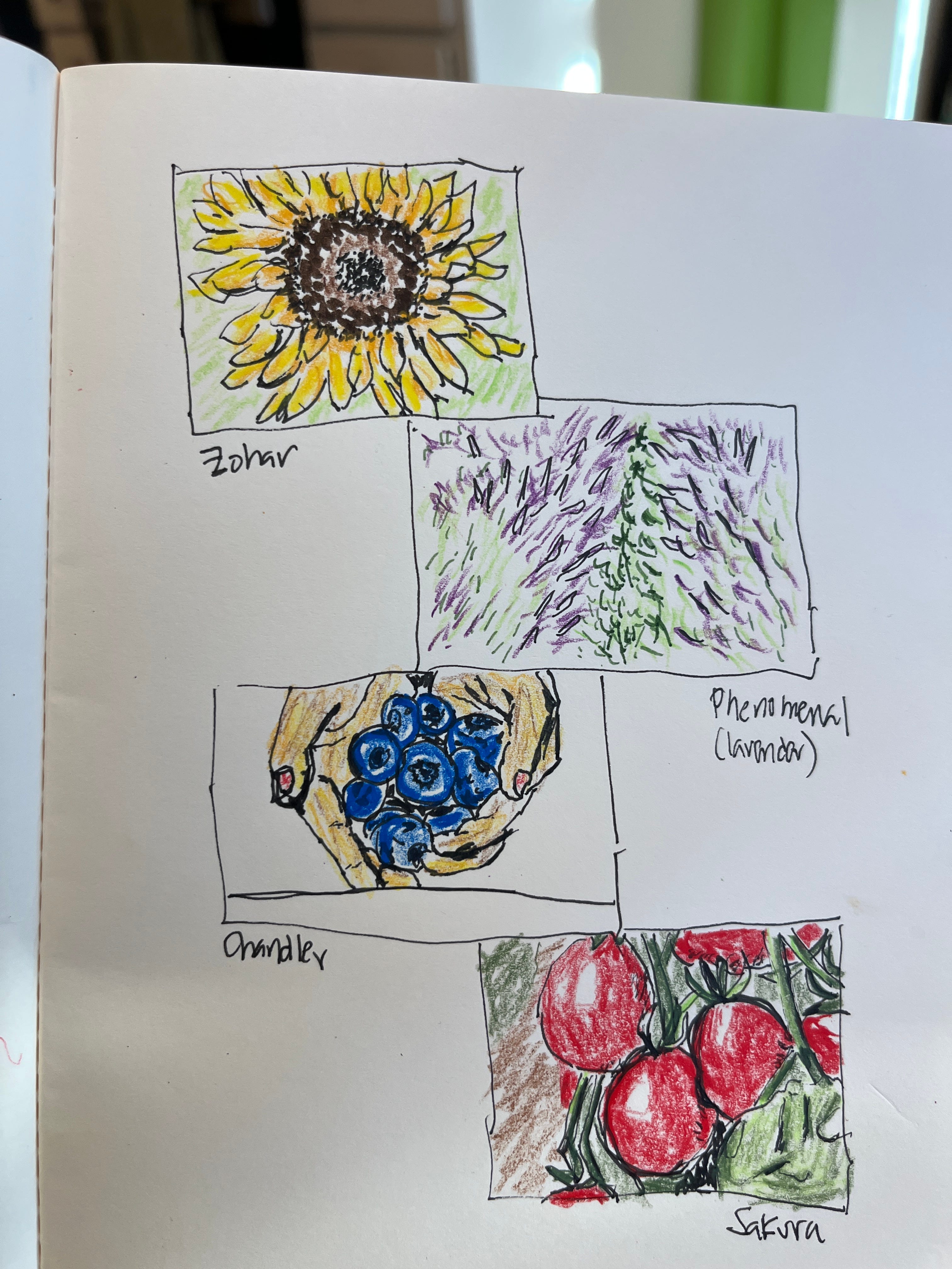 Then I made another box and drew a red onion. Then green onions. Then a cantaloupe. Since then, I have not stopped. I’ve drawn at least one box with a fruit or flower of vegetable in it every day. Most days, I draw more than one.