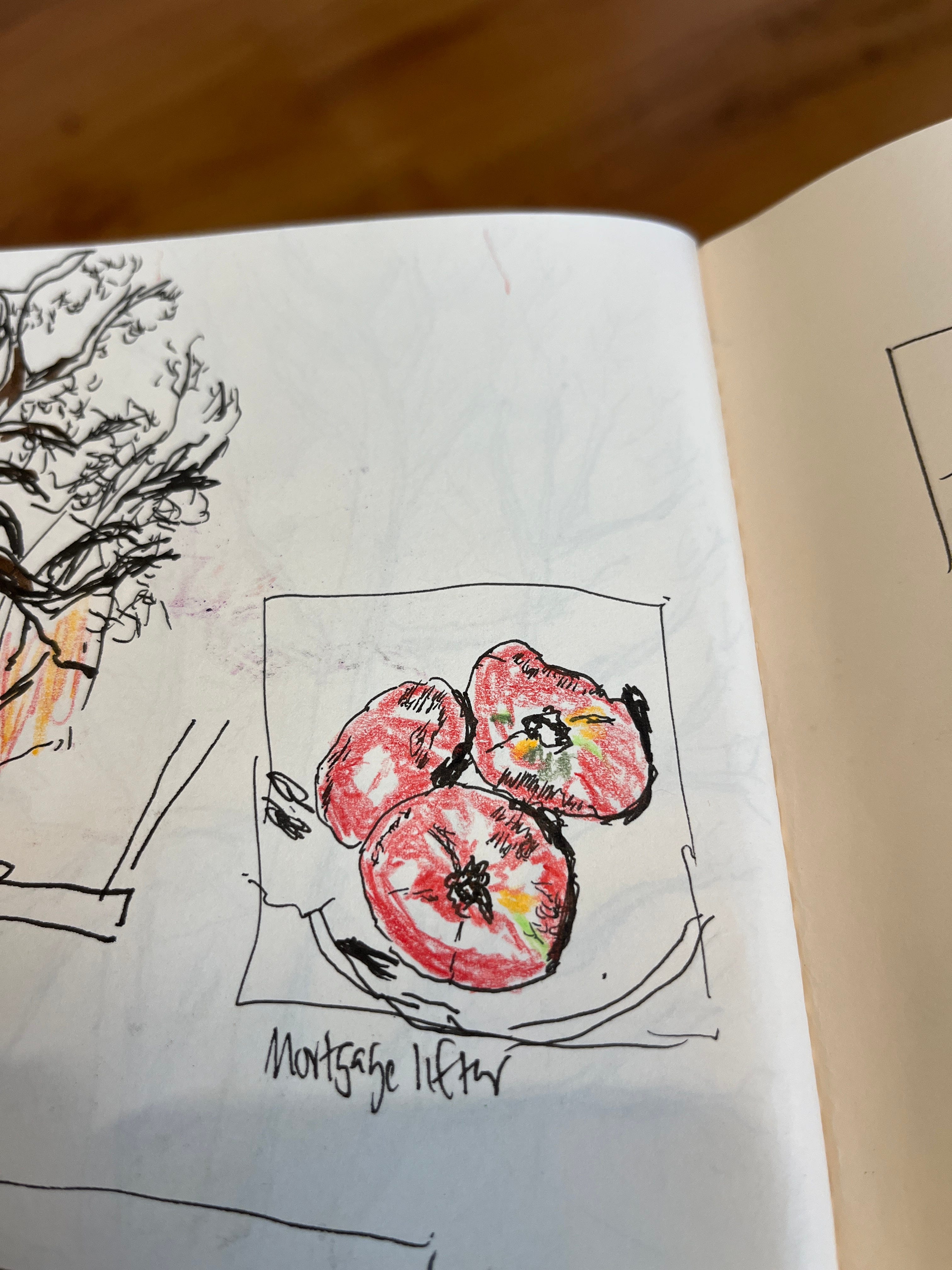 In that liminal holiday space, I noticed the bag of art supplies, next to the seed catalog. I opened up the seed catalog. I pulled out a pen. Made a square on the page of a sketchbook about the same size as the square in the seed catalog and began to draw some tomatoes. Mortgage lifter tomatoes, specifically (I’ve always loved that name).
